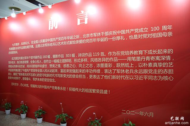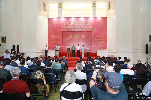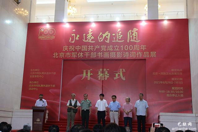 以“永远的追随”为主题的北京市军休干部庆祝中国共产党成立100周年书画摄影诗词作品展在北京民族文化宫展览馆开幕。这是北京军休老兵以艺术形式献给亲爱的党百年华诞的一份厚礼 ,是对党对祖国母亲的挚爱倾诉。